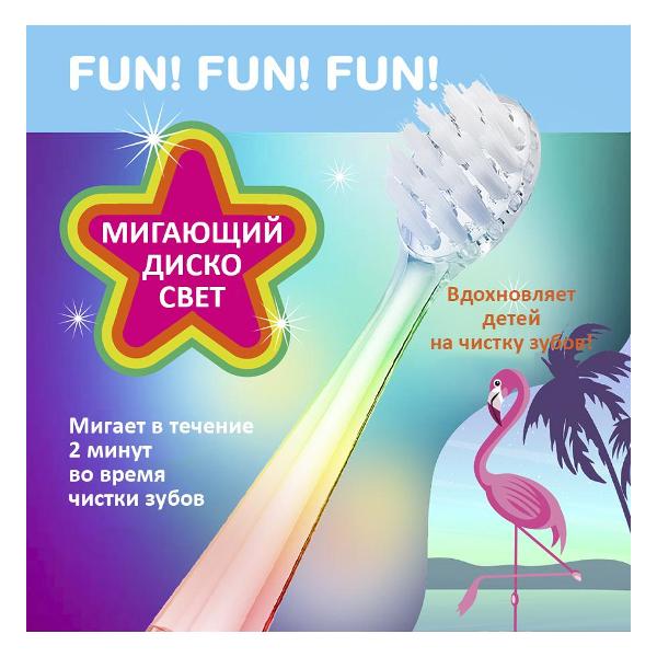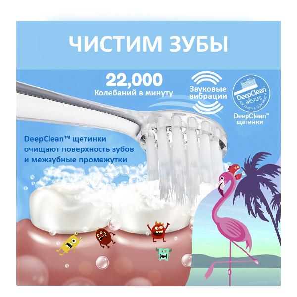 Электрическая зубная щетка Brush Baby KidzSonic «Фламинго» Blue (BRB193) - это модель, предназначенная для детей в возрасте от 3 до 6 лет. Устройство работает непрерывно на протяжении 2 минут. Приспособление поможет научить ребенка правильно чистить зубы с помощью индикации. Вибрационный импульс срабатывает каждые 30 секунд, напоминая о необходимости смены зоны обработки. Световой сигнал оповестит об окончании процедуры.