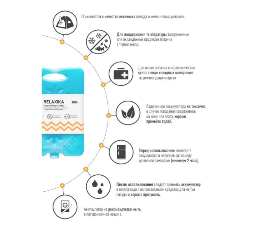 Перед использованием поместите аккумулятор в морозильную камеру до полной заморозки (минимум 2 часа). После использования следует промыть аккумулятор в теплой воде с использованием средства для мытья посуды и хорошо просушить. Аккумулятор не рекомендуется мыть в посудомоечной машине. Содержимое аккумулятора не токсичено, в случае попадания содержимого на кожу или глаза, хорошо промоете водой, в случае проглатывания по не осторожности – выпейте большое количество воды, при необходимости обратитесь к врачу.