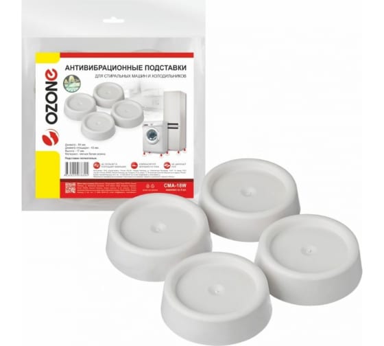 Антивибрационные подставки OZONE белые, круглые, полнотелые CMA-18W эффективно поглощают вибрацию, компенсируют неровности пола. Устанавливаются на ножки холодильников и стиральных машин.