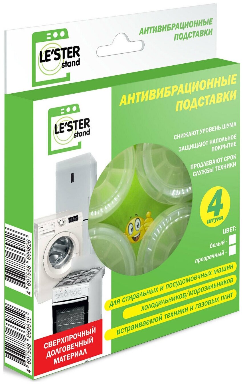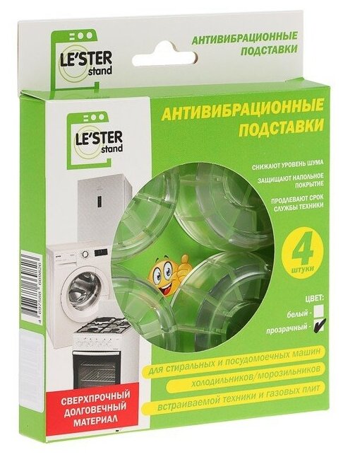 Комплект вибропоглощающих защитных подставок для стиральных машин или холодильников изготовлен из специального высокопрочного полимерного материала. Оптимальная форма и цельная структура подставки позволяют добиться значительного снижения вибрации. В случае изменения местоположения холодильника или стиральной машины Вы будете избавлены от необходимости закрывать следы от его ножек или делать дорогостоящий ремонт.