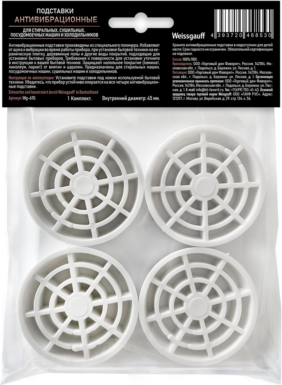Антивибрационные подставки произведены из специального полимера. Избавляют от шума и вибрации во время работы прибора, при установке бытовой техники на керамическую плитку, деревянные полы и другие виды покрытий, подходящие для установки бытовых приборов. Требования к поверхности для установки уточните в инструкции к вашей бытовой технике. Защищают напольное покрытие (ламинат, линолеум, паркет) от вмятин и царапин. Предназначены для стиральных машин, посудомоечных машин, сушильных машин и холодильников. Инструкция по эксплуатации: Установите подставки под ножки используемой бытовой техники. Убедитесь, что прибор устойчиво опирается на все четыре антивибрационные подставки. Храните антивибрационные подставки в недоступном для детей месте.