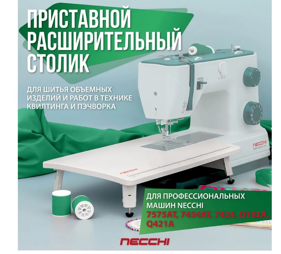 Дополнительный столик NECCHI Q серия - это идеальное дополнение к швейным машинам Necchi Q серии, таким как Necchi Q132A, Q133A, Q134A, Necchi Q421A, а также для Necchi 7424, Necchi 7434AT, Necchi 7575AT. Этот столик обеспечивает удобство и функциональность при работе с швейной машиной. Он позволяет разместить ткань на столешнице, что значительно упрощает процесс шитья.