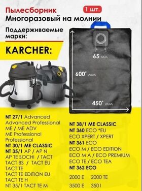 Для пылесоса KARCHER (Керхер) NT 35/1, Bosch GAS 35, DEWALT (Девалт), FLEX (Флекс), HAMMER (Хаммер), HAMMERFLEX (Хаммерфлекс), HILTI (Хилти), METABO (Метабо)