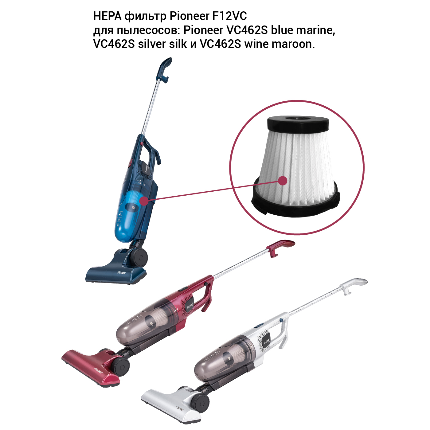 HEPA фильтр для пылесоса Pioneer F12VC предназначен для пылесосов Pioneer VC462S blue marine, VC462S silver silk и VC462S wine maroon.