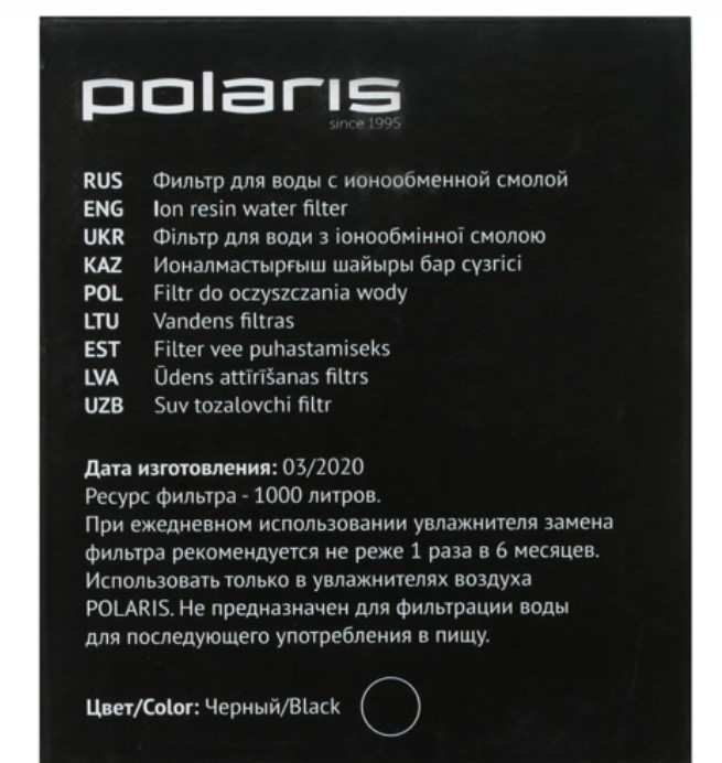 Фильтр очистки воды с ионообменной смолой очищает воду от примесей, продлевает срок службы увлажнителя, предотвращает образование белого налета. Ресурс фильтра зависит от состава используемой воды. Замена фильтра рекомендуется не реже 1 раза в 6 месяцев.