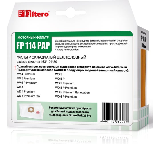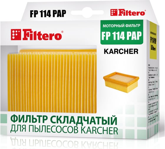 Фильтр Filtero FP 114 PAP Pro предназначен для пылесосовKARCHER Подходит для моделей: MV 4 Premium, MV 5 Premium, MV 6 P Premium, WD 4 Premium, WD 5 Premium, WD 5 Renovation, WD 6 P Premium, аналог 2.863-005.0