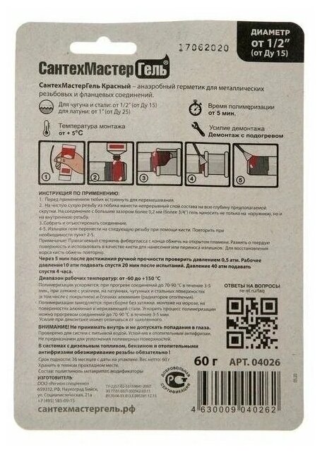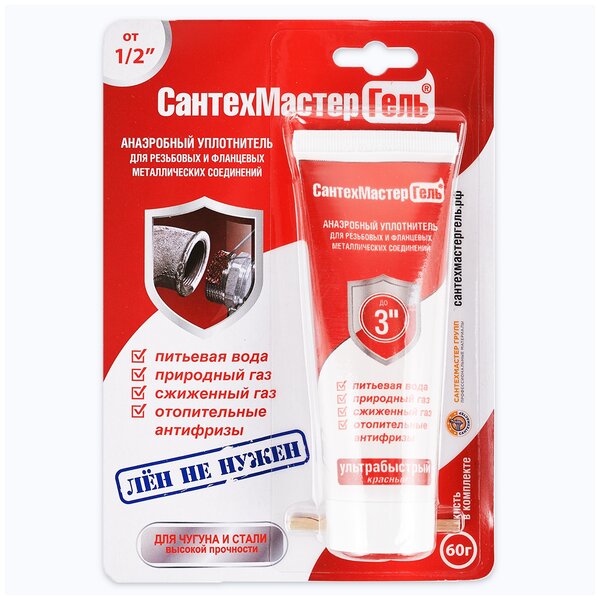 Анаэробный состав для ремонта изношенных резьб, для уплотнения фитингов с большим зазором (черный металл). При демонтаже может потребоваться прогрев. СтопмастерГель Красный анаэробный герметик для металлических резьбовых и фланцевых соединений. Образует высокопрочное уплотнение, устойчивое к различным средам: вода, природный и сжиженный газ, бензин, отопительные антифризы и др. Подойдет для труб диаметром до 3 дюймов. Соединение, собранное на СтопмастерГель Красный демонтируется с подогревом. Диапазон рабочих температур от -60 до +150C.
