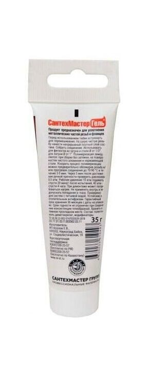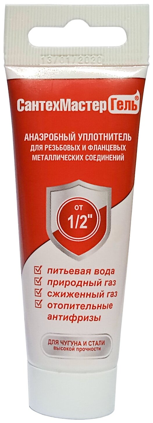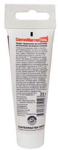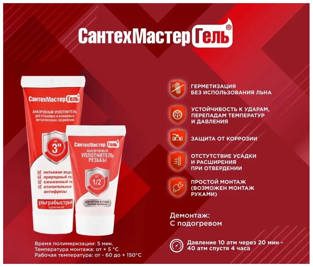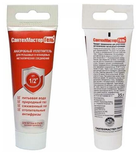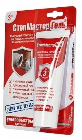 Гель СантехМастер (красный; тюбик 35 гр; с еврослотом) - это анаэробный герметик для резьбовых соединений из черного металла. Этот гель отлично подходит для сверхпрочной фиксации и герметизации резьбы и фитингов в трубопроводах, собранных с использованием черных металлов. Применяется для соединений диаметром от 1,5".