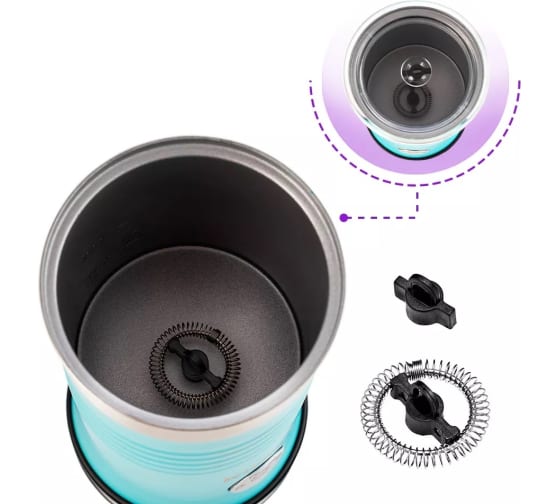 Все части капучинатора съёмные и поэтому легко очищаются. На крышке предусмотрено силиконовое кольцо для прочной фиксации во время вспенивания.