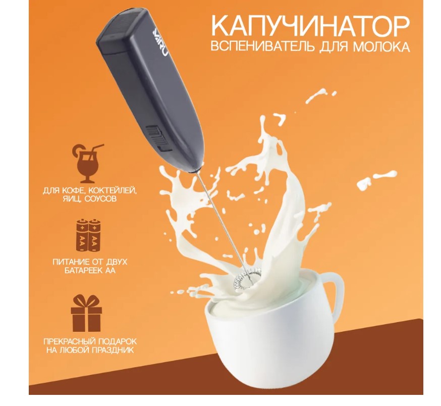 Вставьте 2 элемента питания типа АА, соблюдая полярность, зафиксируйте крышку отсека для батарей. Для начала работы нажмите кнопку питания на корпусе и вспениватель молока начнет работать. После использования протрите капучинатор влажной тканью со слабым мыльным раствором, после чего протрите насухо. Не опускать в воду. Срок годности и хранения не ограничен при соблюдении условий хранения.