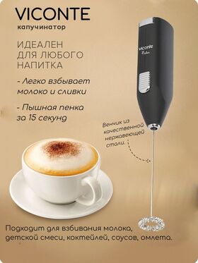 Капучинатор Viconte VC-4401, мощность 3W. Питание 2хАА батарейки. Удобный корпус с покрытием "soft-touch", венчик из высококачественной нержавеющей стали.