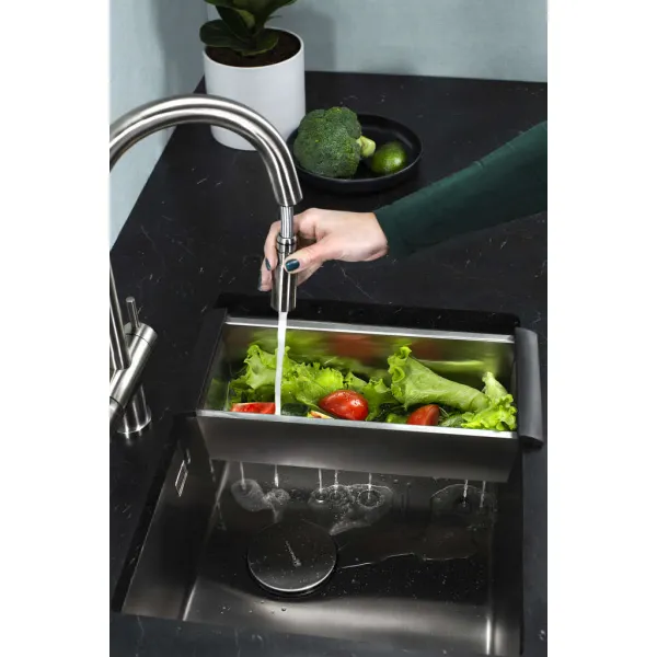 Коландер может крепиться в чаше мойки, либо на ее крыле