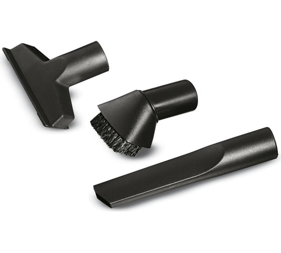 Комплект насадок, состоящий из щелевой насадки, насадки для мягкой мебели и щеточной насадки. Подходит ко всем пылесосам Kärcher для сухой или влажной и сухой уборки с номинальным диаметром принадлежностей DN 35.