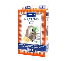 Бумажные фильтр-мешки VESTA FILTER ER 03 для пылесосов BORK, CLATRONIC, ELENBERG, POLARIS. Фильтр-мешок VESTA FILTER обладает фильтрующими качествами, задерживает 99 % пыли устраняя вредные бактерии благодаря двухслойной степени фильтрации и обеспечивает защиту Вашего пылесоса. В комплектацию входят 5 пылесборников из бумаги