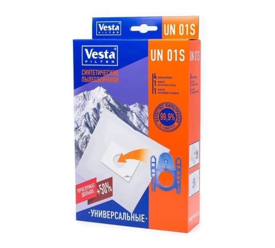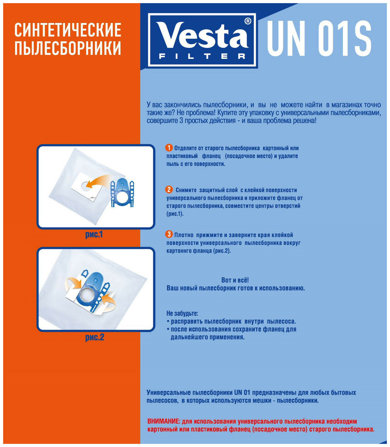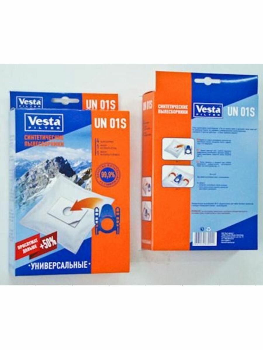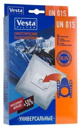 Мешки для пылесосов Vesta filter UN01S для ЛЮБЫХ бытовых пылесосов. Мешки с клейкой основой , используются в случае наличия рамки от оригинального мешка, которую потребуется приклеить на мешок из набора UN 01 S. Произведены из синтетического микроволокна, обладают высокоэффективным качеством фильтрации в 99.9 % (0.3 микрон), обеспечивают очистку воздуха выходящего из пылесоса. Благодаря синтетическому материалу мешки VESTA FILTER UN 01S не боятся воды и острых предметов, сохраняют мощность пылесоса при заполнении, вмещают в себя больше содержимого чем мешки из бумаги. В комплектацию входят 4 пылесборника , 1 фильтр моторного отсека и 1 фильтр выходящего воздуха.