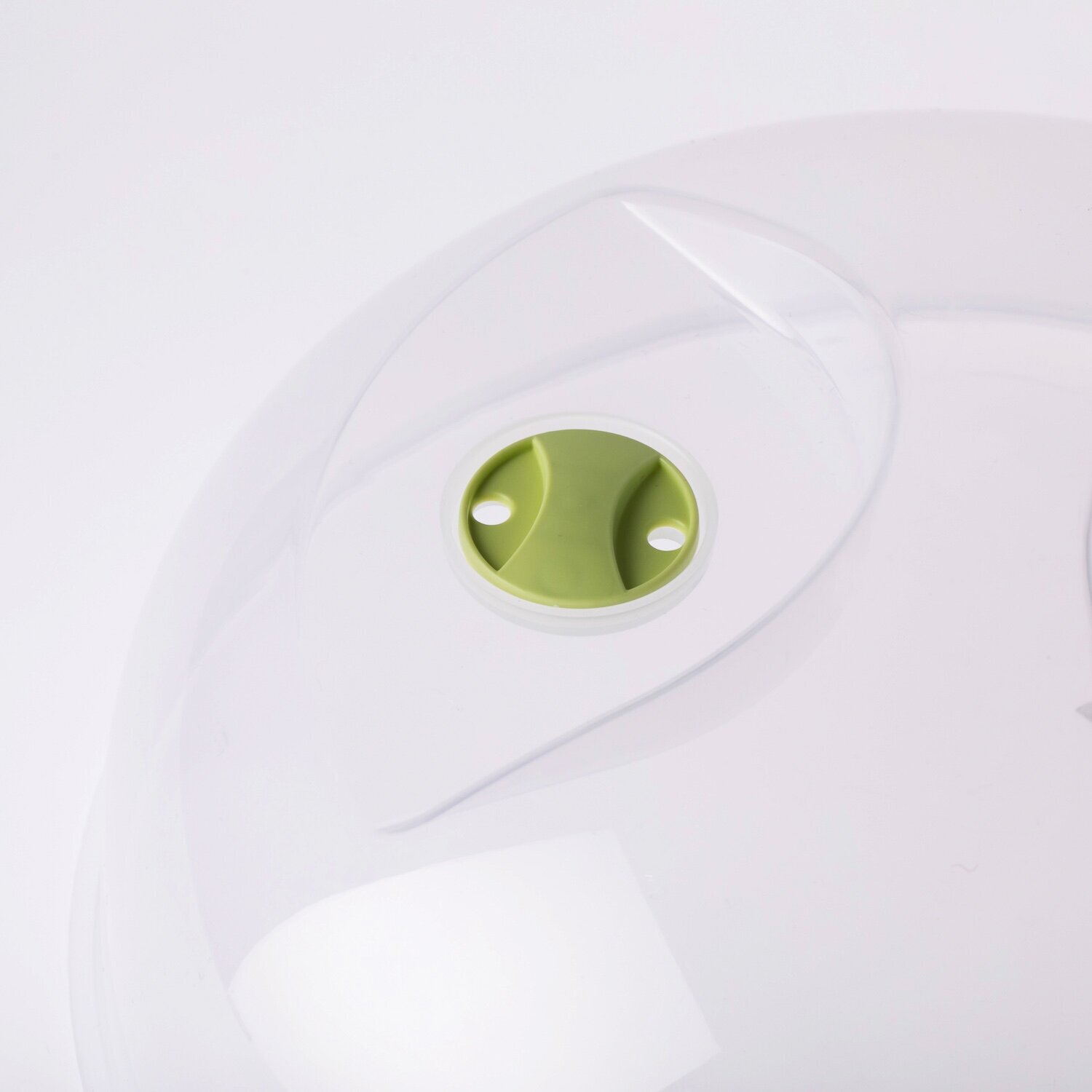 Крышка с клапаном для выпуска пара предохраняет внутреннюю поверхность микроволновой печи от загрязнения в процессе разогревания или приготовления пищи (с открытым клапаном). Клапан для выпуска пара имеет два положения: открыт/закрыт. Имеется удобная ручка для удержания крышки.