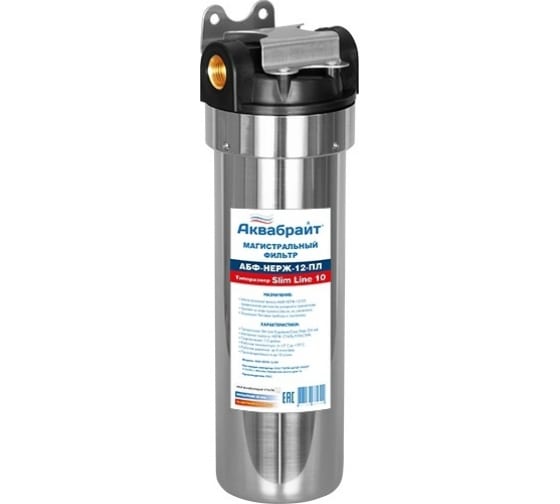 Магистральный фильтр АКВАБРАЙТ 10 из нержавеющей стали, с пластиковой крышкой АБФ-НЕРЖ-12-ПЛ 33678 устанавливается в водопроводную магистраль и предназначен для очистки холодной и горячей воды.