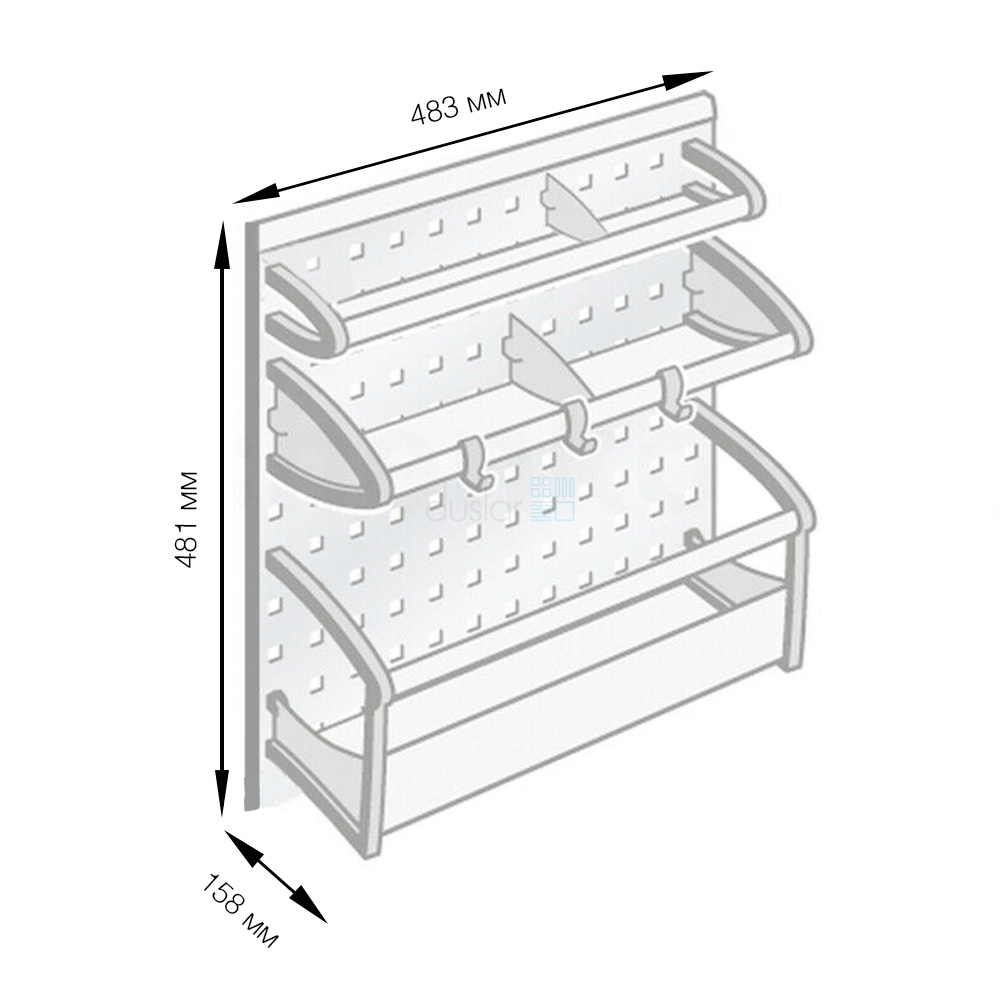 Направляющие полного выдвижения из металла, алюминиевая панель, 3 навесные полки - алюминий и серый пластик, разделители, крючки, проставки для монтажа со стороны петель, шаблон для монтажа.