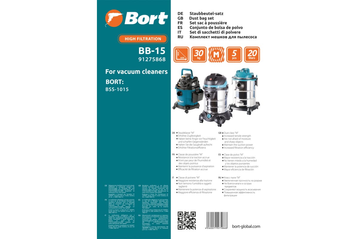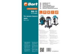 Комплект мешков пылесборных для пылесоса BB-15 BORT 91275868 состоит из прочных фильтр-мешков из многослойной синтетической ткани повышенной плотности. Позволяют собирать мельчайшие частицы пыли, влажный и строительный мусор. Класс фильтрации - М. Подходят к пылесосу BORT BSS-1015.