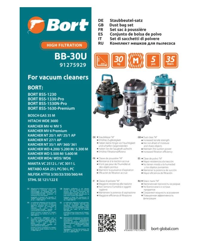 Набор из прочных фильтр-мешков из многослойной синтетической ткани повышенной плотности. Позволяют собирать мельчайшие частицы пыли, влажный и строительный мусор. Класс фильтрации «М».