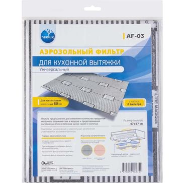 Универсальный аэрозольный фильтр Neolux AF-03 для кухонной вытяжки снижает количество продуктов неполного сгорания газа в воздухе и предотвращает загрязнение стен и потолка кухни сажей и копотью. Индикатор загрязненности на фильтре изменяет цвет с чёрного на красный, когда требуется произвести замену фильтра.