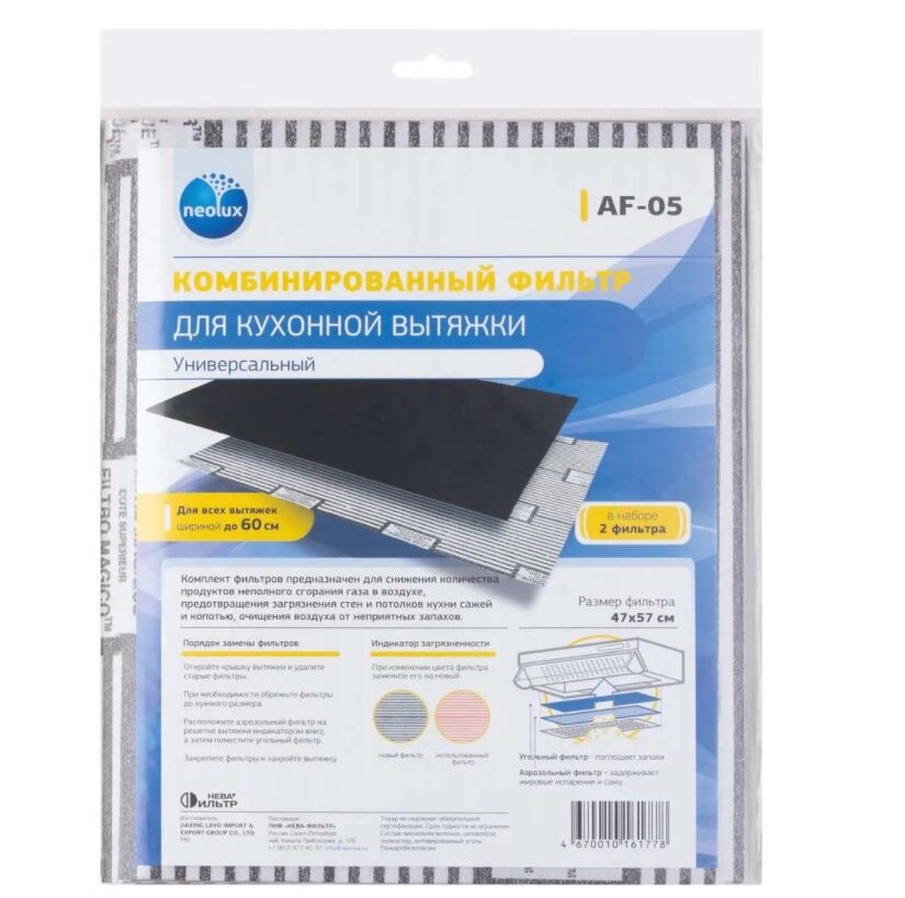 Универсальный комбинированный фильтр Neolux AF-05 предназначен для снижения количества продуктов неполного сгорания газа в воздухе, предотвращения загрязнения стен и потолка кухни сажей и копотью и очищения воздуха от неприятных запахов. Удаляемые механические и аэрозольные загрязнения улавливаются волокнами аэрозольного фильтра, а угольный фильтр поглощает запахи. Индикатор загрязненности на аэрозольном фильтре изменяет цвет с чёрного на красный, когда требуется произвести замену фильтра. Угольный фильтр рекомендуется менять не реже 1 раза в 6 месяцев.
