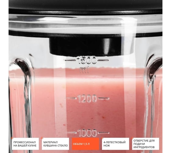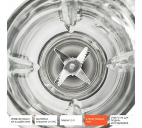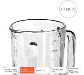 Блендер для кухонной машины RKMA-1001 представляет собой вместительный кувшин объемом 1,5 л с крышкой. На дне кувшина закреплены крепкие металлические лезвия.