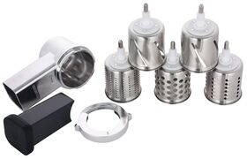толкатель, барабан №1 для мелкой терки, барабан №2 для крупной терки, барабан №3 для тонких ломтиков, барабан №4 для крупных ломтиков, барабан №5 для мелкой стружки, инструкция, гарантийный талон.