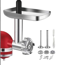 Насадка-мясорубка 5KSMMGA подходит для всех планетарных миксеров Китчен Эйд. Дополнительно в комплекте есть щетка и футляр, а также удобный толкатель и самозатачивающийся нож.