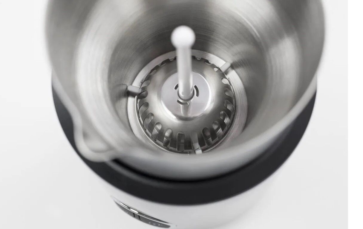Панель управления расположена на корпусе из глянцевого пластика. Внутри пеновзбиватель выполнен из нержавеющей стали с антипригарным покрытием. Для безопасного использования устройство оснащено теплоизоляционной вставкой в корпусе. Основание можно поворачивать на 360°.Устройство может нагревать до 250 мл молока, вспенивать до 250 мл молока в режиме холодной пены и до 150 мл в режиме горячей пены. Отличается простотой в очистке. Есть функция автоматического отключения и подогрева молока 77-80°C (+/- 5 градусов).