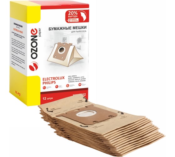 Мешки-пылесборники Ozone P02 предназначены для пылесоса ELECTROLUX, также подойдут для пылесосов брендов: AEG, BORK, PHILIPS, TORNADO, VOLTA, ZANUSSI.