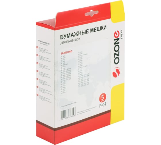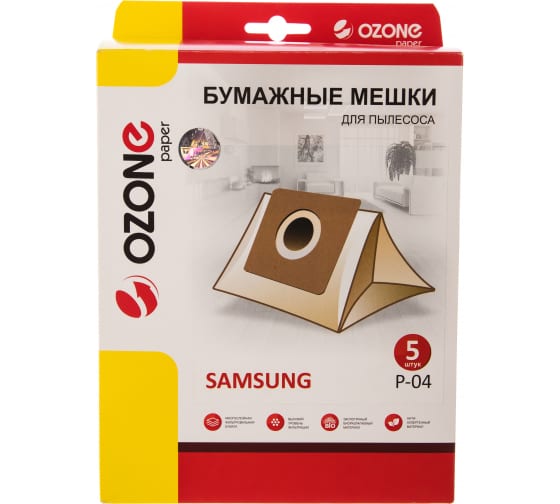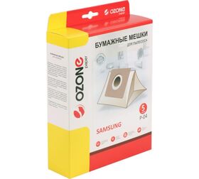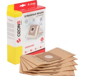 Мешки-пылесборники оригинальные бумажные OZONE (5 шт.) Samsung P-04 представляют собой расходный материал, предназначенный для бытовых пылесосов. Материал мешков - двухслойная бумага повышенной прочности, обладающая хорошими фильтрационными свойствами. Способны задерживать мельчайшие частицы пыли. Подходят для однократного использования.