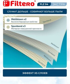 Пылесборники Filtero ЭКСТРА произведены из синтетического микроволокна MicroFib. Очень прочные, они не боятся острых предметов и влаги, собирают больше пыли (до 50%) и обеспечивают уровень очистки воздуха 99,9%, что значительно выше, чем у бумажных пылесборников. При этом мощность всасывания пылесоса сохраняется в течение всего периода службы пылесборника.