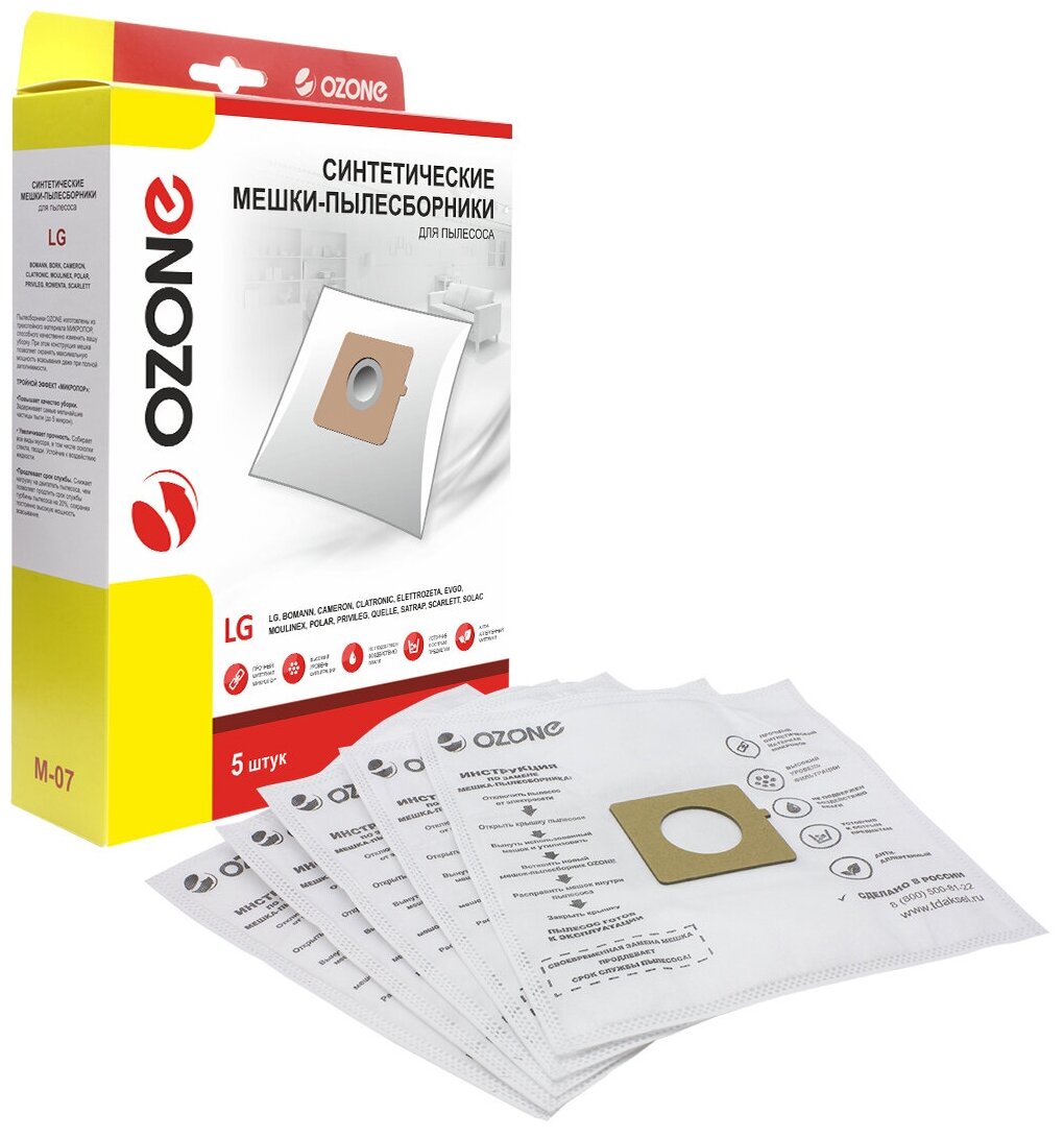 Мешки-пылесборники Ozone являются сменным аксессуаром для пылесосов. Представляют собой первую ступень очистки, удерживая основную массу мусора и пыли. Синтетический белый материал мешков электризует мельчайшие частицы пыли, три слоя волокнистой структуры обеспечивают гипоаллергенные характеристики и улучшенную фильтрацию, задерживая частицы размером от 0.3 мкм. Рамка изготовлена из плотного картона, резиновое кольцо-уплотнитель плотно фиксирует мешок на месте. Мешки надежны, при попадании в пылесос любых режущих или острых предметов не рвутся, выдерживают высокое давление, не размокают при встрече со случайно попавшим влажным мусором. Такие мешки крайне желательно применять при уборке сильно замусоренных квартир, кабинетов, после ремонта. Использование мешков-пылесборников продлевает срок службы пылесоса и его фильтров