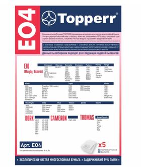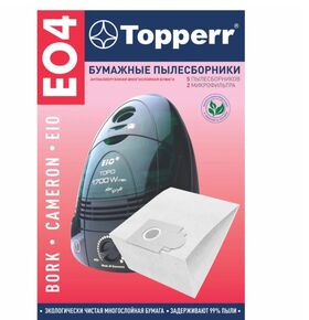 Бумажные пылесборники Topperr EO 4 для пылесосов Bork, Cameron и EIO изготовлены из экологически чистой трехслойной бумаги, соответствующей европейскому стандарту качества, задерживают 99% пыли, продлевая срок службы пылесоса, сохраняют чистоту воздуха и устраняют вредные бактерии.