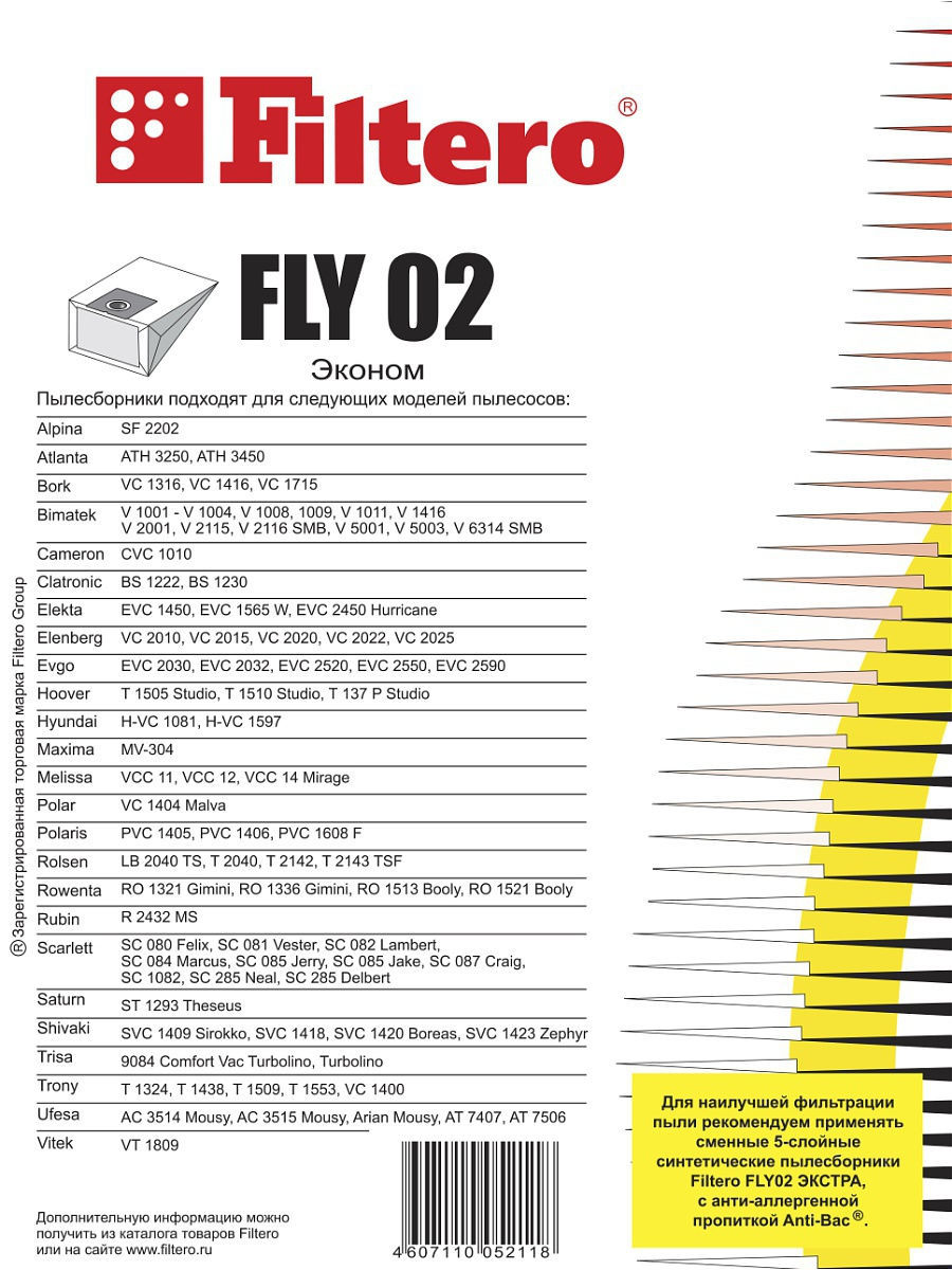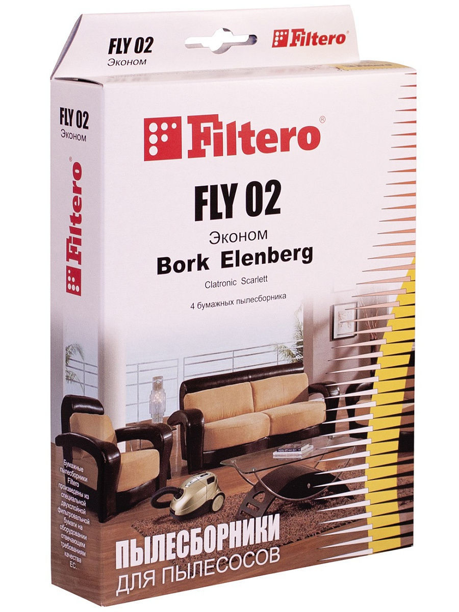 Бумажные пылесборники Filtero произведены из специальной двухслойной фильтровальной бумаги на оборудовании соответствующему европейскому стандарту качества ISO 9002 Пылесборники Filtero FLY 02 подходят для следующих торговых марок пылесосов: ALPINA, ATLANTA, BIMATEK, BORK, CAMERON, CLATRONIC, ELEKTA, ELENBERG, EVGO, HOOVER, HYUNDAI, MELISSA, POLAR, POLARIS, ROLSEN, ROWENTA, SCARLETT, SHIVAKI, TRONY, UFESA, VITEK