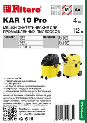 Мешки для промышленных пылесосов Filtero KAR 10 Pro, 3-х слойные, произведены из синтетического микроволокна MicroFib. Прочность синтетических мешков Filtero KAR 10 Pro превосходит любые бумажные мешки-аналоги, даже если это оригинальные бумажные мешки всемирно известных марок.