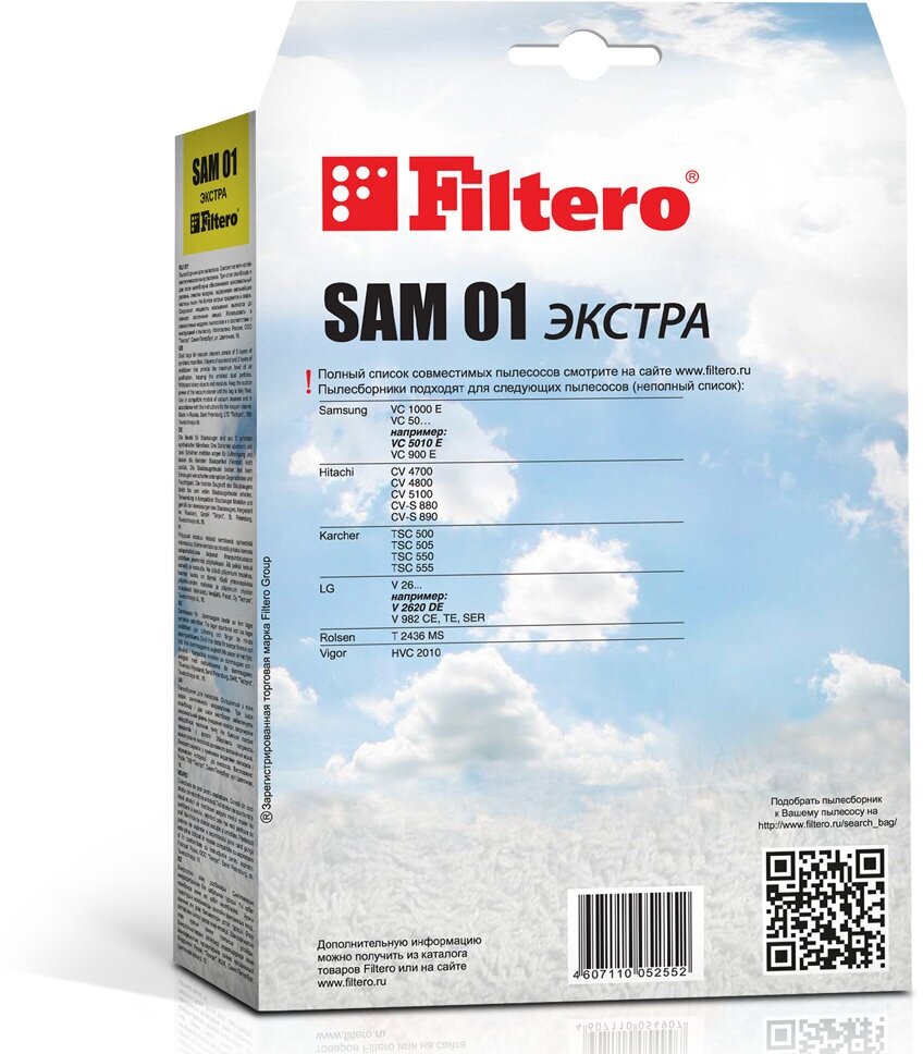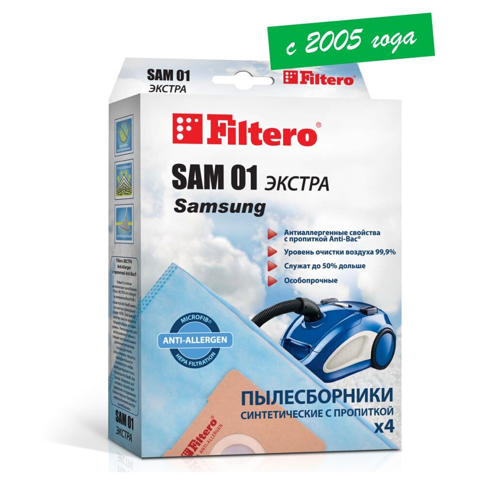 Благодаря универсальной конструкции мешок-пылесборник Filtero SAM 01 Экстра может использоваться в таких марках пылесосов как Rolsen, Samsung, Vigor, Hitachi, Karcher, LG. Специальная пятислойная синтетика эффективно устраняет мельчайшие частицы пыли и вредоносные микроорганизмы. Установка и замена пылесборника производится с помощью прочной рамки мешка, сделанной из плотного картона. Такой клапан мешка позволяет надежно закрепить его в пылесосе и не даст возможности случайно раскрыться. В комплект Filtero SAM 01 Экстра входит четыре сменных мешка голубого цвета. Изделие не предусмотрено для многоразового использования.