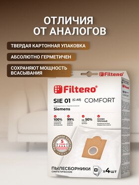 Пылесборники Filtero SIE 01 Comfort произведены из 5-ти слойного синтетического микроволокна. В отличие от бумажных мешков, Filtero Comfort не рвутся, не боятся острых предметов и влаги, собирают больше пыли.