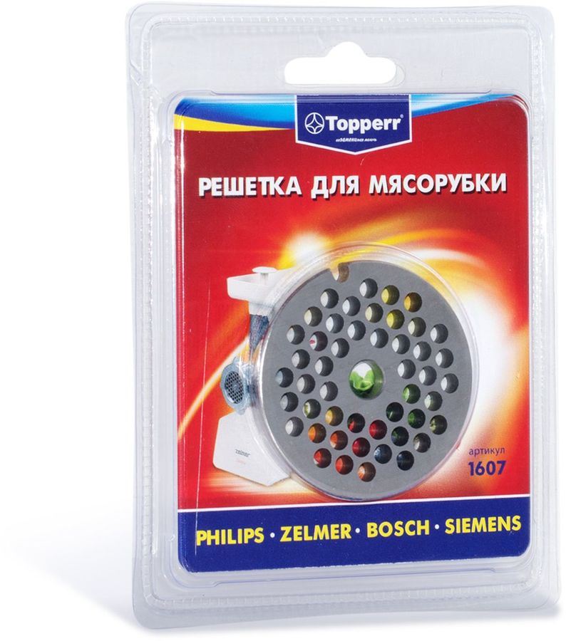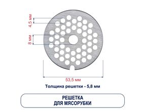 Решетка из стали Topperr 1607 для мясорубки подходит для моделей Zelmer, Bosch, Braun, Philips и кухонных комбайнов (O диска 53 мм, O центрального отверстия 8 мм, O отверстий 4,5 мм.)