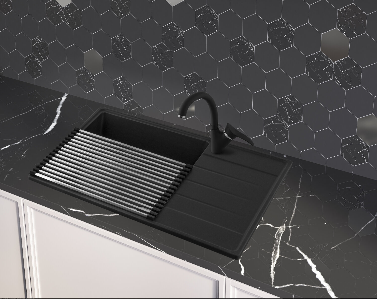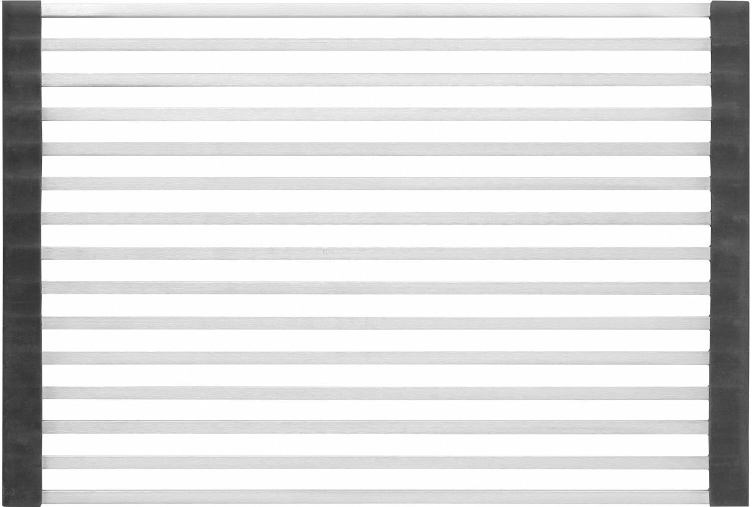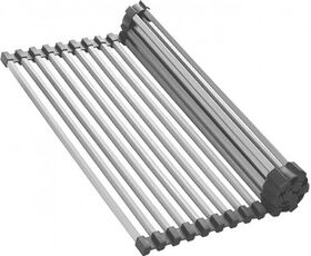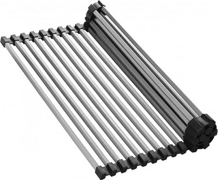 Ролл-мат Weissgauff – удобный и современный аксессуар для кухни, который расстилается на крыле или на чаше мойки, а также на столешнице. На нем можно сушить посуду, овощи и фрукты (без контакта с поверхностью), разделывать и чистить рыбу. Также ролл-мат используется в качестве подставки под горячее, в том числе и на столешнице из искусственного камня. Он легко скручивается в компактный рулон и занимает мало места при хранении. Размер ролл-мата – 440 х 305 мм, он состоит из 15 прутьев с квадратной формой сечения из высококачественной нержавеющей стали марки AISI 304, а также из термоустойчивого силикона