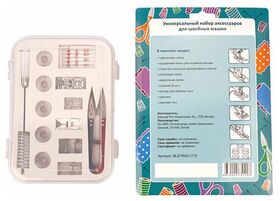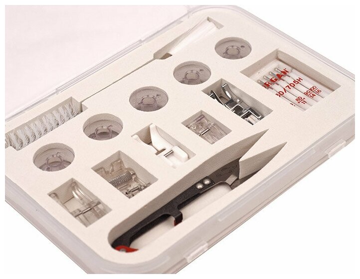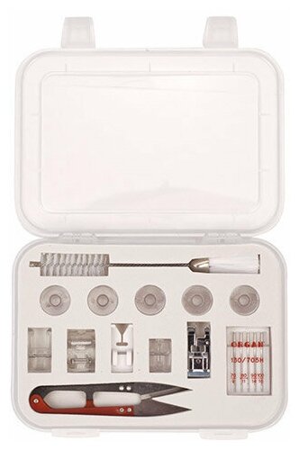 шпульки 5 штук, щёточка для чистки, тефлоновая лапка, роликовая лапка, оверлочная лапка, лапка для вшивания потайной молнии, открытая лапка для декоративных строчек, набор игл Organ №70-100, ниппер для обрезки нити