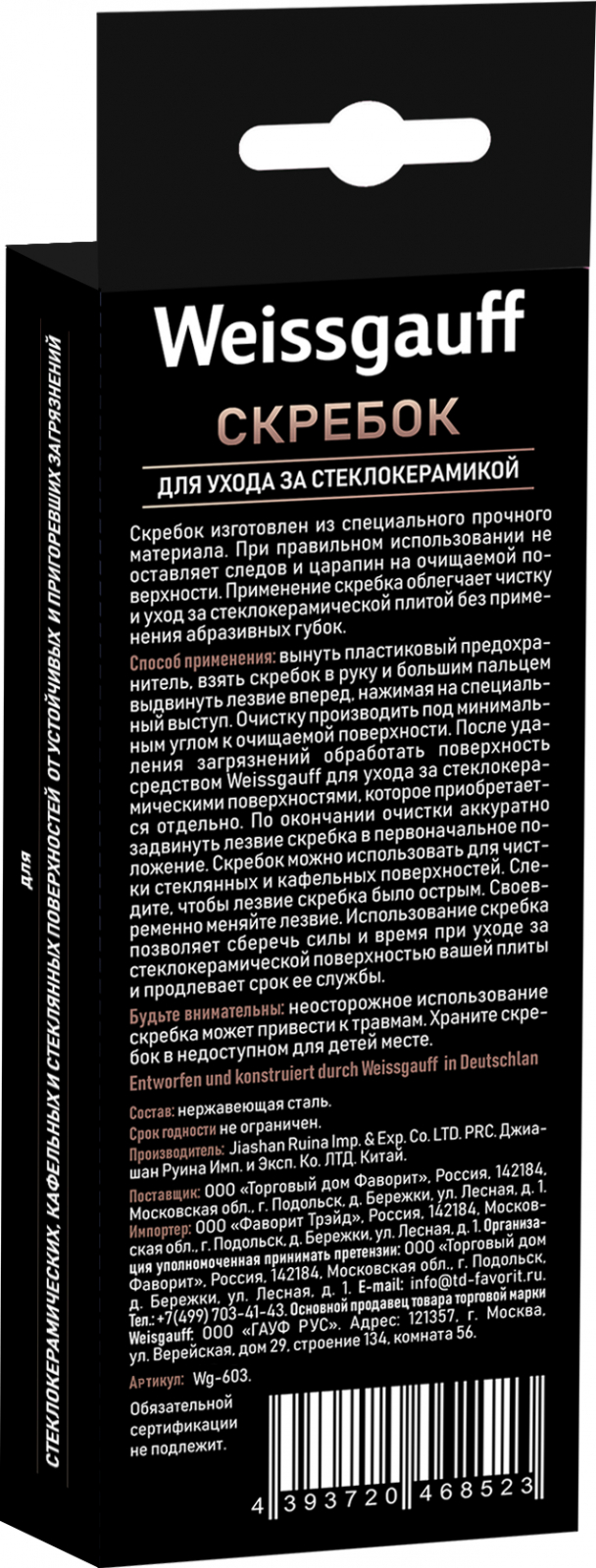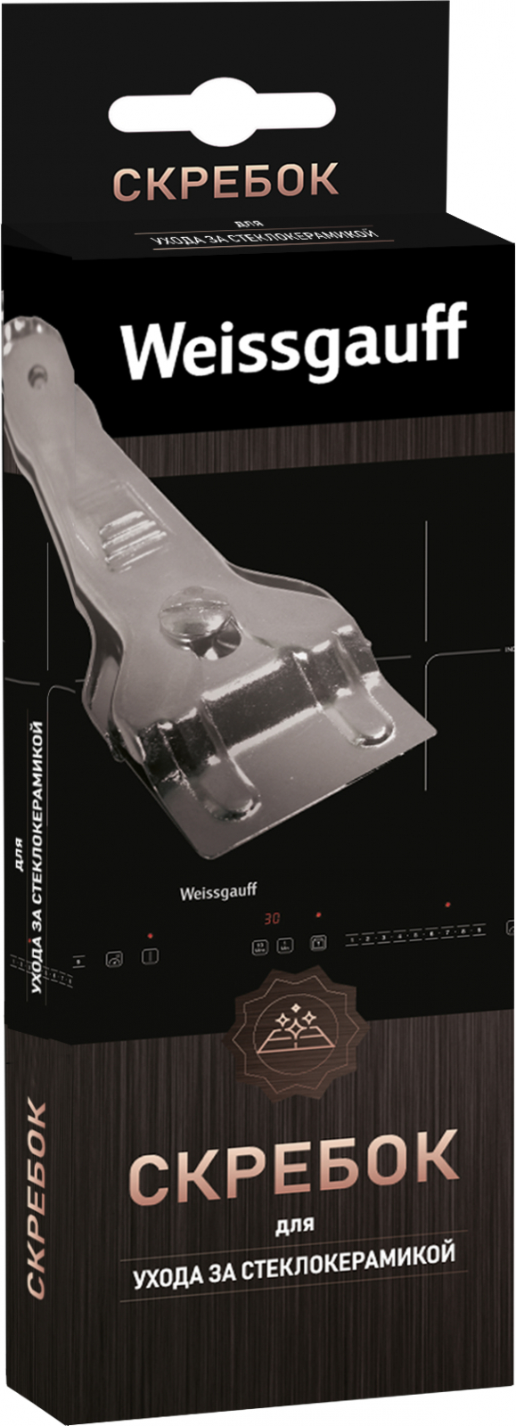 Скребок изготовлен из специального прочного материала. При правильном использовании не оставляет следов и царапин на очищаемой поверхности. Применение скребка облегчает чистку и уход за стеклокерамической плитой без применения абразивных губок. Способ применения: вынуть пластиковый предохранитель, взять скребок в руку и большим пальцем выдвинуть лезвие вперед, нажимая на специальный выступ. Очистку производить под минимальным углом к очищаемой поверхности. После удаления загрязнений обработать поверхность средством Weissgauff для ухода за стеклокерамическими поверхностями, которое приобретается отдельно. По окончании очистки аккуратно задвинуть лезвие скребка в первоначальное положение. Скребок можно использовать для чистки стеклянных и кафельных поверхностей. Следите, чтобы лезвие скребка было острым. Своевременно меняйте лезвие. Использование скребка позволяет сберечь силы и время при уходе за стеклокерамической поверхностью вашей плиты и продлевает срок ее службы. Будьте внимательны: неосторожное использование скребка может привести к травмам. Храните скребок в недоступном для детей месте.