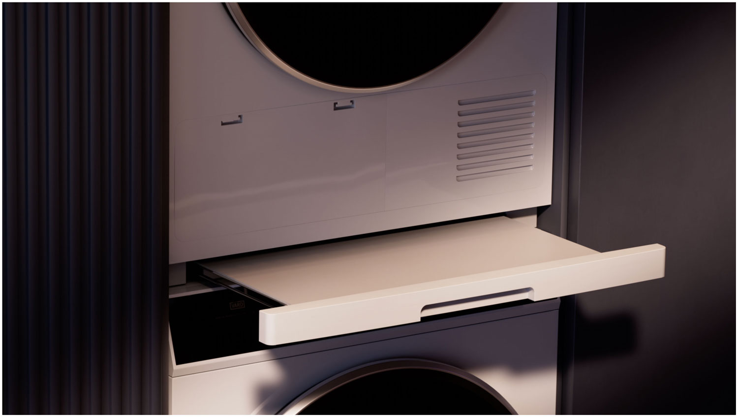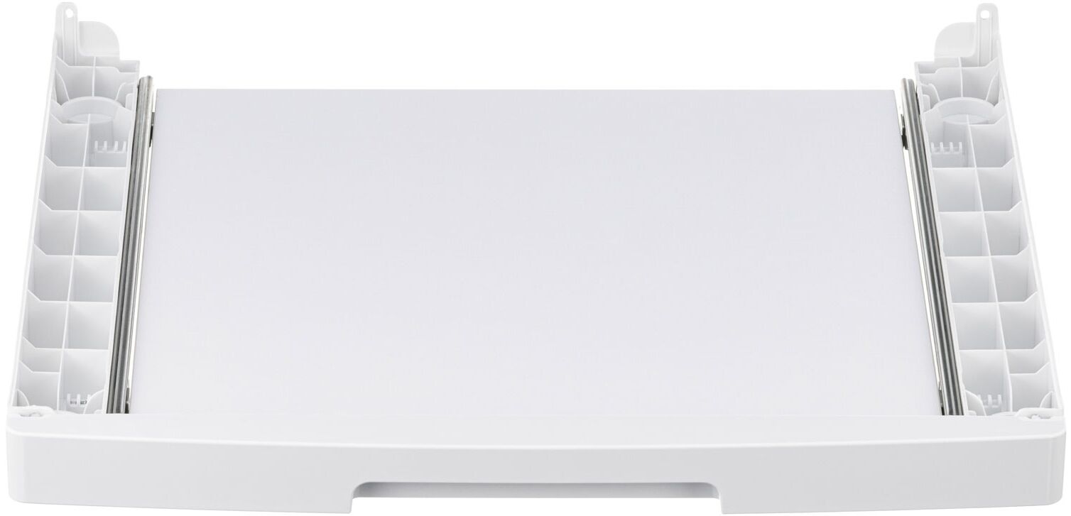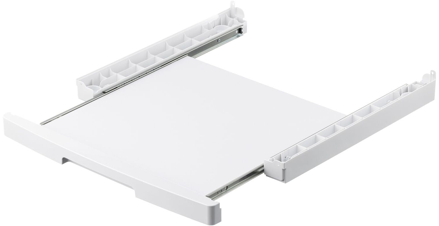 Вам больше не придется держать вещи на весу, чтобы вынуть их из сушильной машины: соединительный комплект в виде выдвижной полки выдержит до 15 кг веса.
