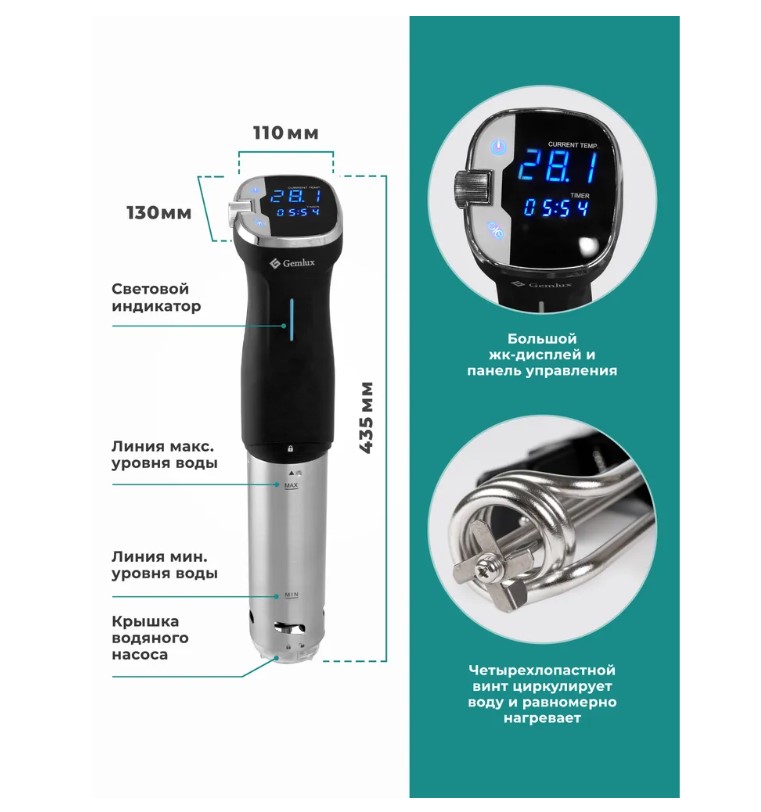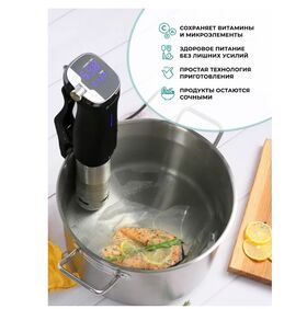 Погружной термостат Gemlux GL-SV800SQ предназначен для длительного низкотемпературного приготовления пищи на водяной бане в условиях домашней кухни. Продукты предварительно упаковываются в пластиковые пакеты при помощи бытового вакууматора. Оборудование оснащено электронной системой управления с ЖК-дисплеем. Температура регулируется в диапазоне 0-90оС с точностью до 0,1оС, время приготовления - до 99 ч. Рециркуляционный насос производительностью 8 л/мин обеспечивает равномерный нагрев воды. Погружной термостат может быть использован с любыми емкостями, объем которых составляет 6-15 л, в том числе с гастроемкостями из поликарбоната, поскольку температура приготовления не превышает 90оС. Устройство закрепляется на стенке емкости при помощи фиксатора. Металлический корпус и колпачок рециркуляционного насоса легко снимаются для очистки и технического обслуживания.