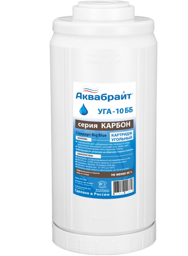Картридж АКВАБРАЙТ УГА-10 ББ изготовлен из гранулированного активированного угля с пищевым допуском.