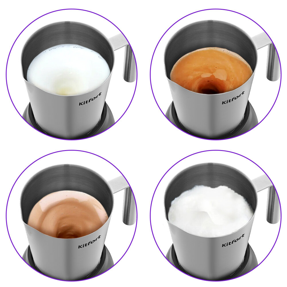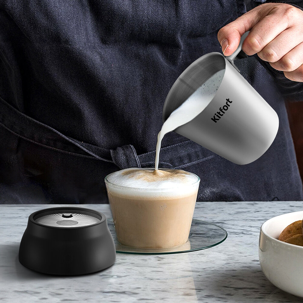 Индукционный капучинатор Kitfort КТ-7156 – простое устройство, которое взбивает пышную молочную пенку всего за несколько минут. С ним вы можете готовить кофейные напитки на базе эспрессо: капучино, латте и латте макиато.