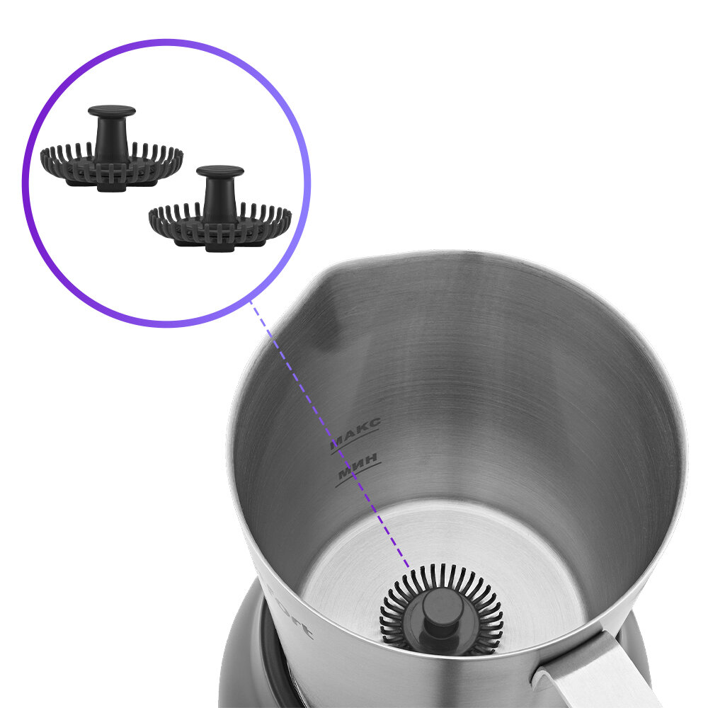 Все части капучинатора съёмные и легко очищаются. Чтобы запасная насадка не потерялась, на дне моторного блока предусмотрено место для её хранения.