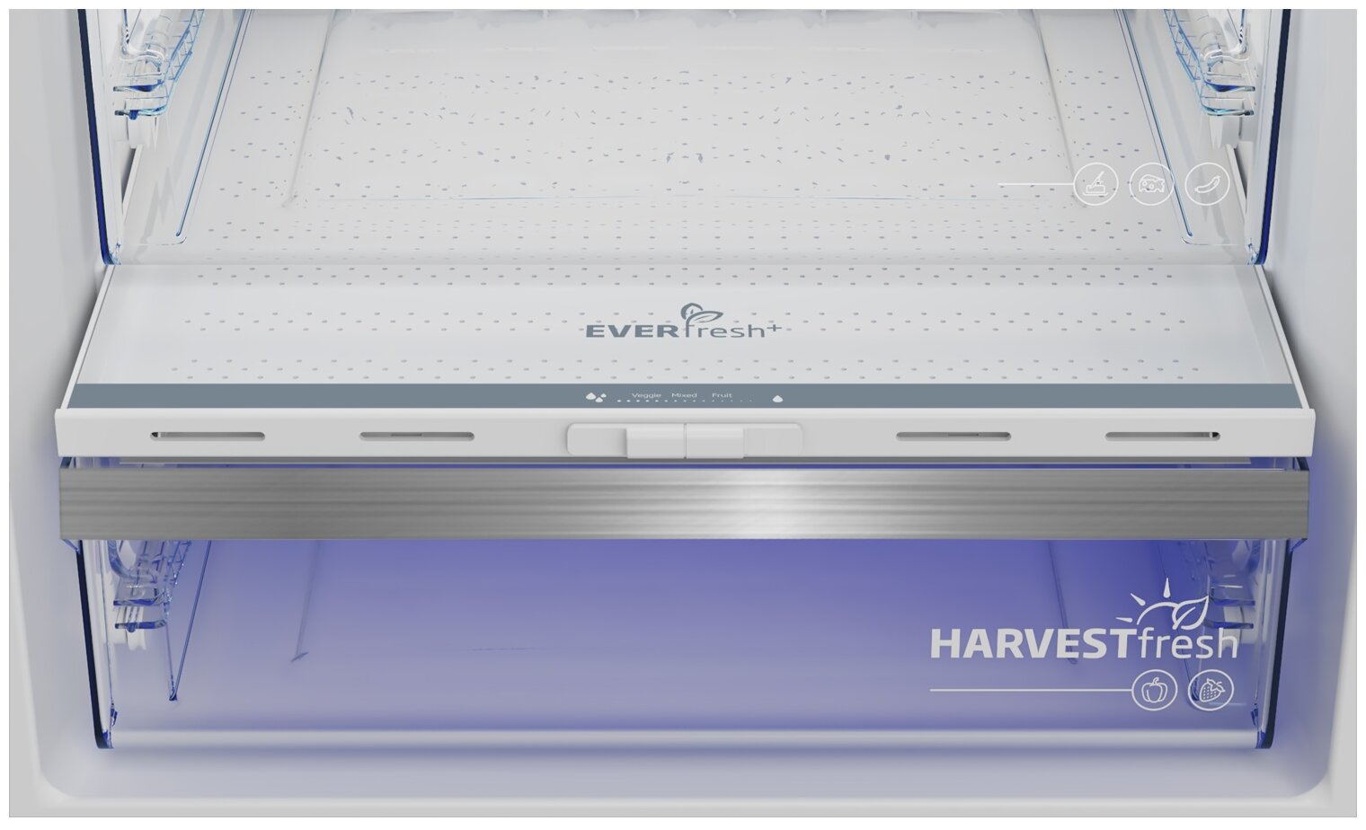 Инновационная технология 3-х цветов от Beko внутри отделения для фруктов и овощей воссоздает природный световой цикл, сохраняя витамины дольше.