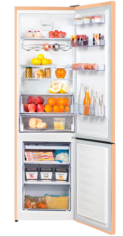 Бежевый двухкамерный холодильник с электронным управлением, общим объемом 400 л и энергосберегающим режимом «Отпуск». Двухконтурная система охлаждения NoFrost Dual Cooling (Ноу Фрост) разделяет воздушные потоки в холодильной и морозильной камерах, не допуская смешивания запахов и образования льда на стенках, поэтому холодильник не нужно регулярно размораживать. Холодильник оснащен отсеком для фруктов и овощей Everfresh и ящиком с температурой 0-3 ˚С для мяса и рыбы, которые позволяют дольше хранить свежие продукты, а также камерой быстрой заморозки для продуктов комнатной температуры.